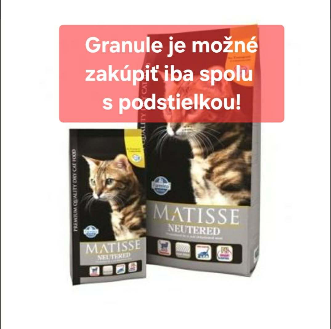 Matisse Neutered je kompletné a vyvážené krmivo pre dospelé, vykastrované mačky. Vďaka svojmu zloženiu zabráni priberaniu. Vysoký obsah kvalitných bielkovín a karnitín udržia svalovú hmotu a zaručujú lepšie využitie tukov. Znížený obsah škrobu a cukru zabraňuje diabetesu. Krmivo je bohaté na vlákninu, čo zaručuje správnu funkciu tráviaceho traktu a eliminuje chlpové gulôčky. Matisse Neutered podporuje ph moču, zvyšuje orálnu hygienu, posiľňuje imunitný systém a udrží správnu hmotnosť.